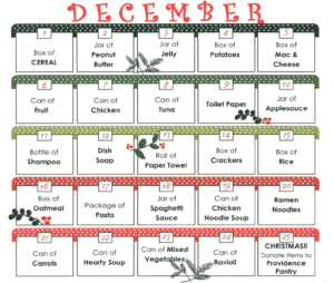 Traditionally, Advent calendars count down the days leading up to Christmas, beginning on December 1 and continuing through Christmas Eve. Most include small doors that open to reveal a picture or small gift. A reverse Advent calendar flips this tradition: instead of receiving a gift each day, participants donate an item each day. Please use the reverse Advent calendar provided by PLC to help replenish the most-needed items in the pantry.
